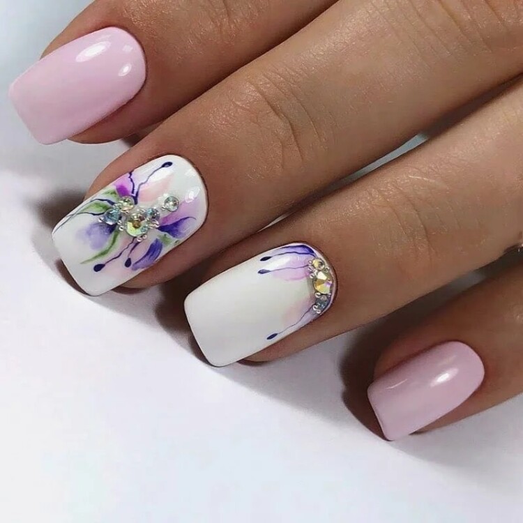 Витонченості образу додасть легкий дизайн в біло-рожевих тонах з камінням, стразами і акварельного розпису.