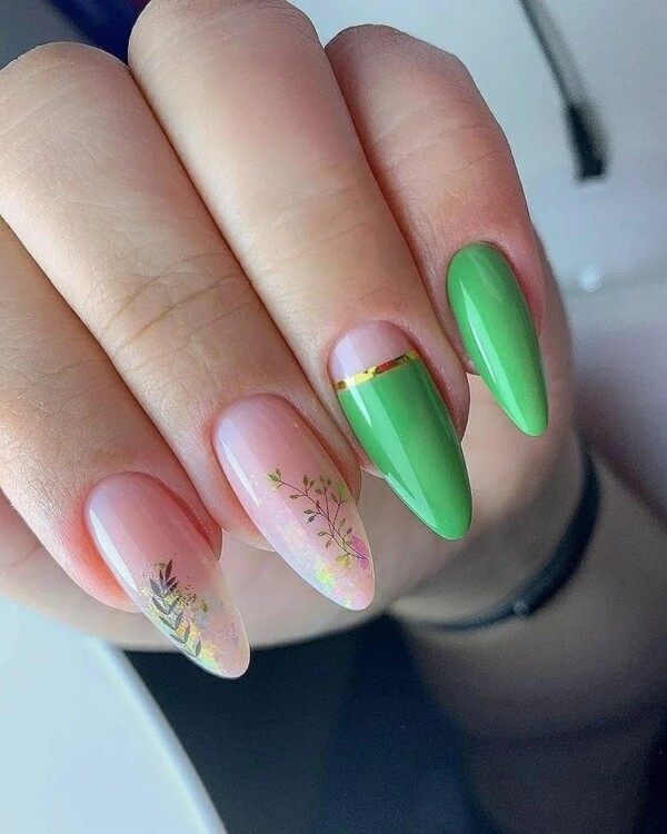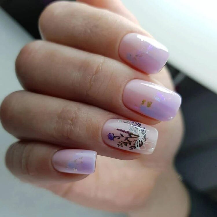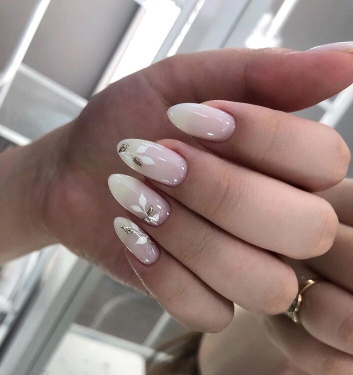 Або ж можна вибрати нюдову базу доповнену фольгою, художнім розписом і блискітками, як на фото.