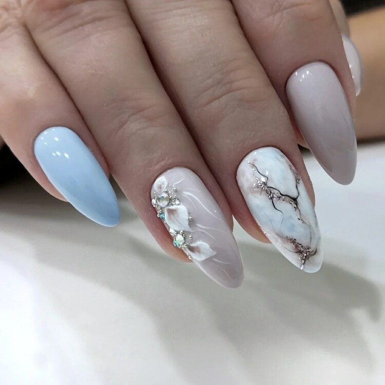Пастельна палітра гель-лаків користується популярністю в будь-який час року. Вона відмінно виглядає з різним видом декору: інкрустацією, акриловим ліпленням, мармуровим дизайном.