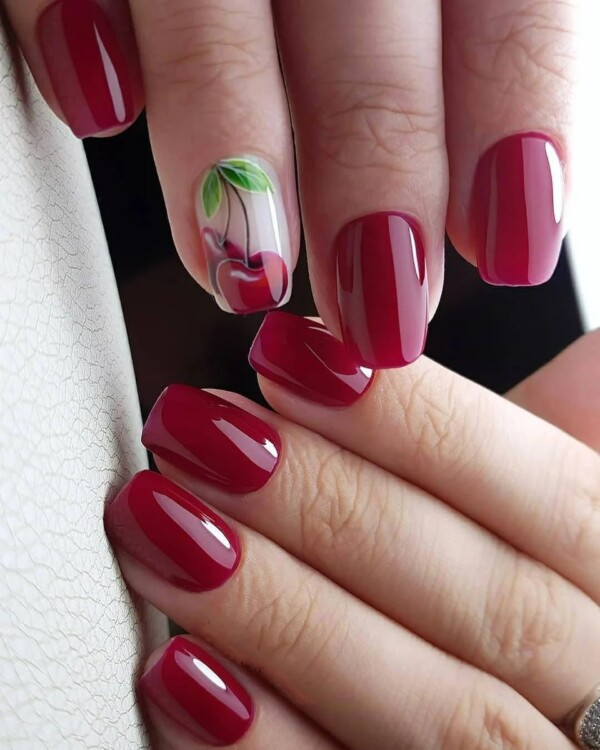 Вишневий відтінок гель-лаку ідеально підходить для повсякденного і вечірнього манікюру. Фімо-дизайн з ягодами і фруктами – актуальний декор літнього сезону.