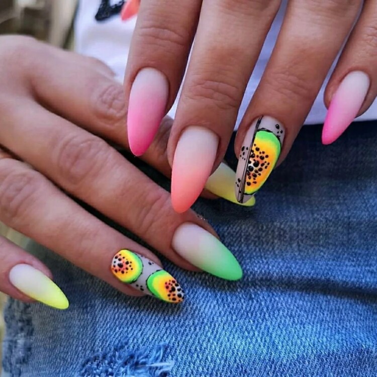 Різнобарвні нігтики внесуть яскраві зміни в ваш образ. З градієнтним дизайном чудово поєднується фруктовий розпис.