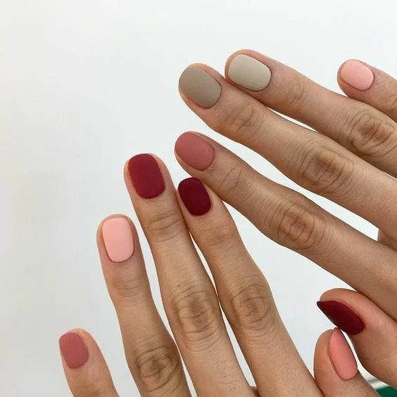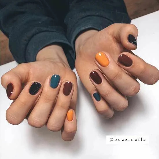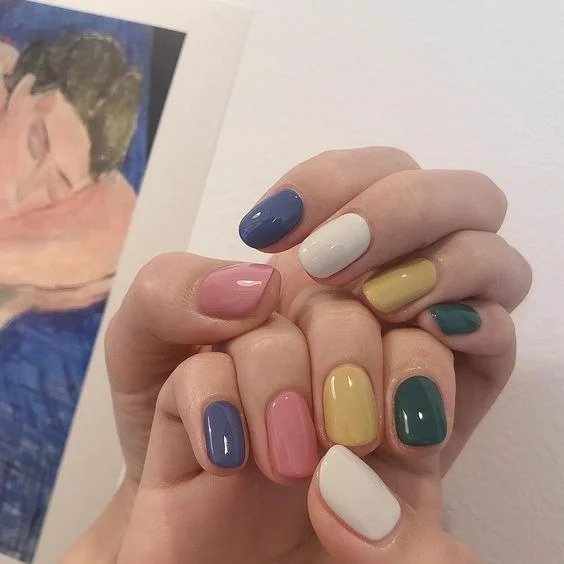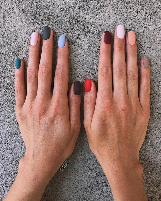 Любителям однотонки без дизайну може сподобатися ще один тренд – різнокольорові нігті. Так, це набагато яскравіше однотонного варіанту, зате в якості прикраси – лише гра кольору без зайвого декору.