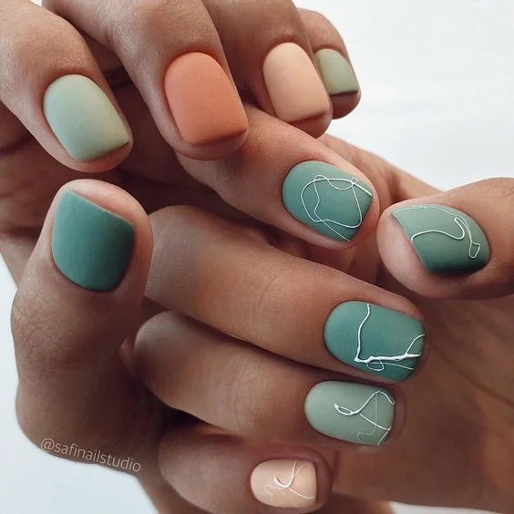 А ось як можуть виглядати ті ж самі різнокольорові нігті, тільки з додаванням мінімалістичного стильного дизайну: