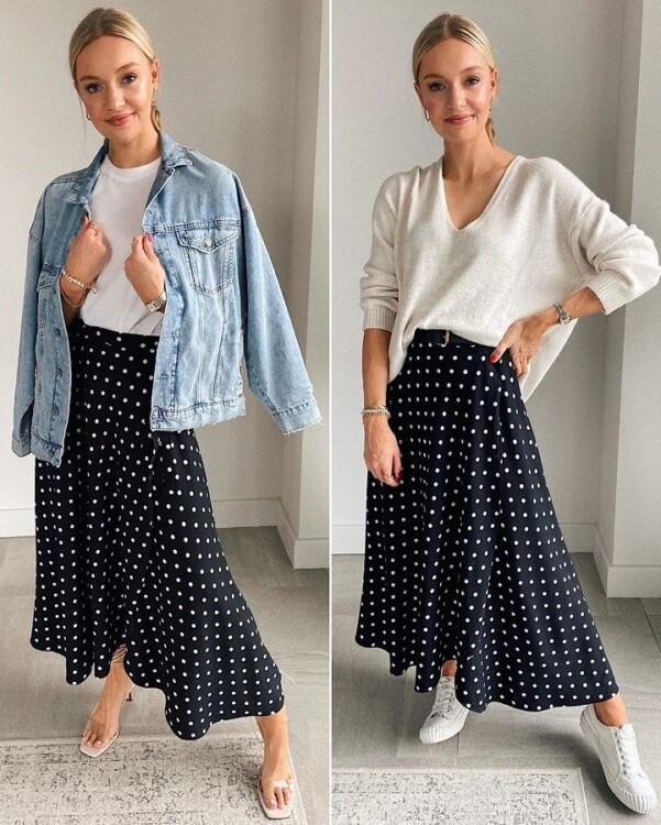 І в завершенні трохи класики – як відмовитися від довгої спідниці в горошок? Два варіанти з одною спідницею, обидва підійдуть для кінця літа і початку осені.