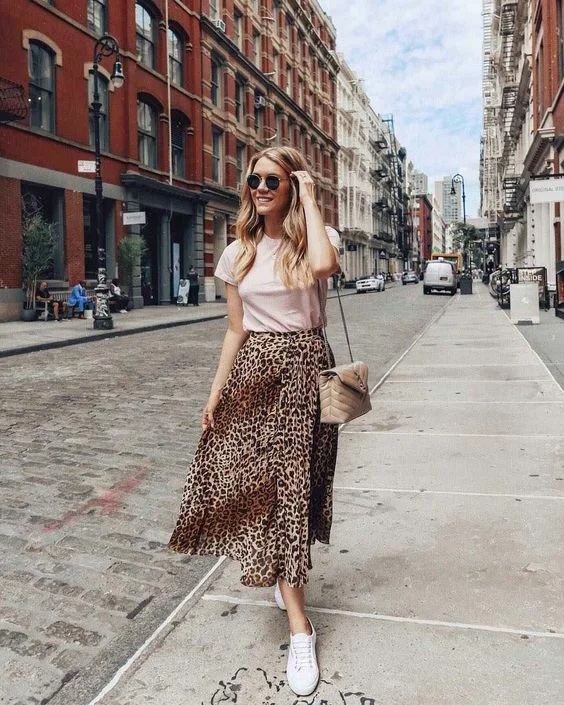 Максі спідниця в трендовий анімалістичний, геометричний або квітковий принт виграшно виглядає в одному тандемі з білими масивними кросівками або світлими кедами. В даному образі будь-яка сучасна жінка може відчувати себе не тільки сексуально і жіночно, але також і досить комфортно. Доповнити настільки сучасний і нестандартний тандем речей можна базовим жакетом або курткою з деніму.