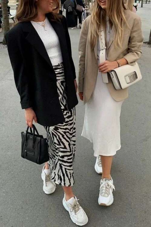 Силуетна максі сукня, виконане з щільного трикотажу + масивні кросівки або світлі кеди – даний тандем може дозволити собі дама в будь-якому віці. Стильний і сексуальний образ заграє новими фарбами і буде виглядати більш збалансовано в одному тандемі з базовим оверсайз жакетом.
