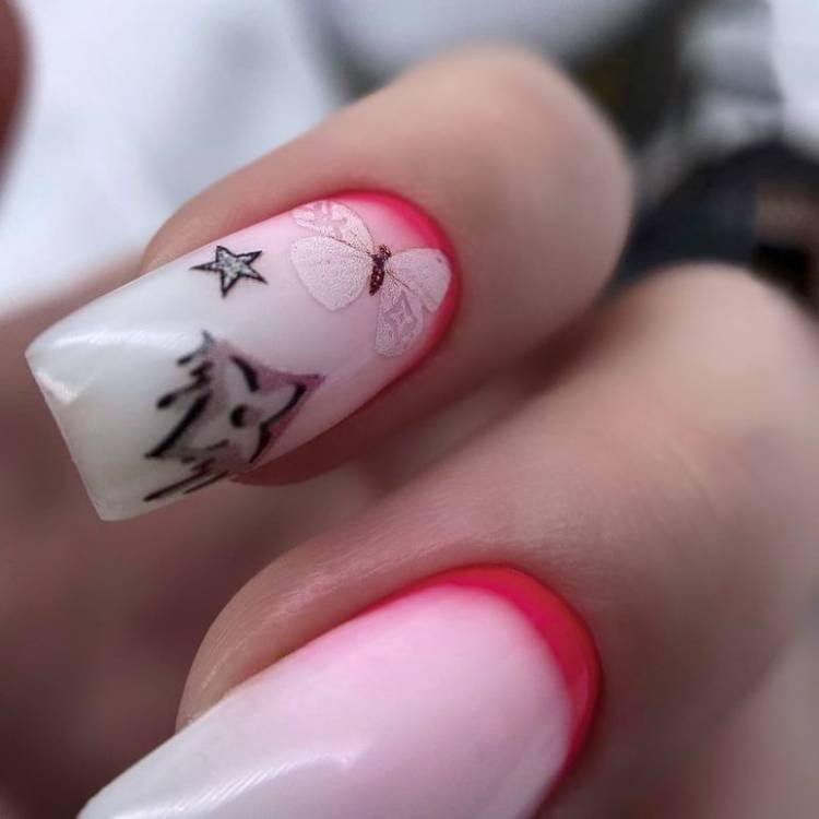 Тренд, який із нами вже кілька сезонів, обростає декоративними деталями. Цієї весни носимо градієнт з неону в молочний колір як підкладку під слайдери, стемпінг та іншу  графіку. Хуліганити, схоже, тягне навіть найніжніших панянок!