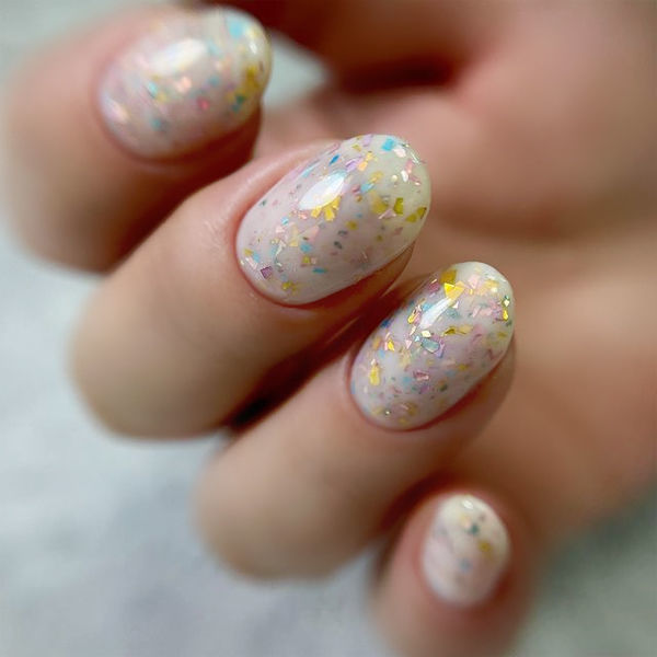 Ця новинка естетично схожа на матеріали із сухоцвітами, але, на відміну від тендітних квіточок, в матеріал додані стабільні і прості в роботі частинки кольорової поталі, схожої чи на забуте «бите скло», чи на колотий черепашник. Такі нігті нагадують милу морську гальку, обкатану морем.