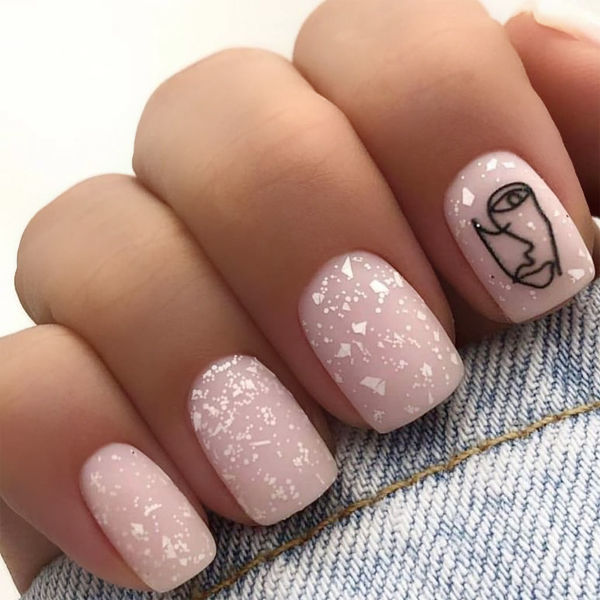 Найпростіший, надшвидкий та розкішний дизайн для тих, кому потрібен манікюр за годину. Пишіть рецепт: гарну базу на ваш смак перекрити матовим топом зі срібними частинками. Якщо дуже хочеться акценту, додати в «бутерброд» між шарами щось графічне – вуаля, ви чарівні!