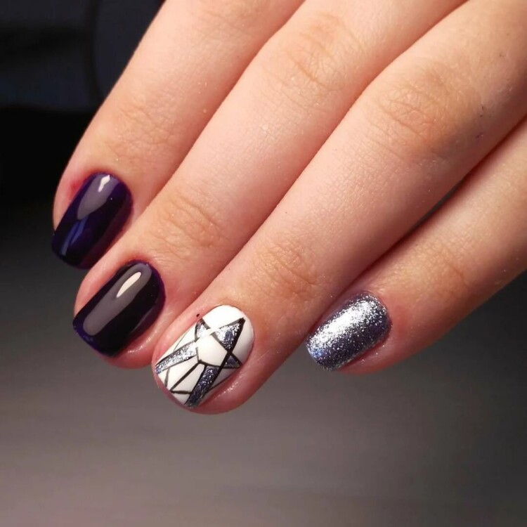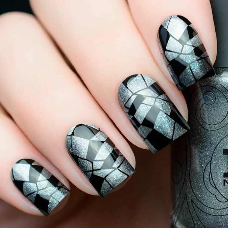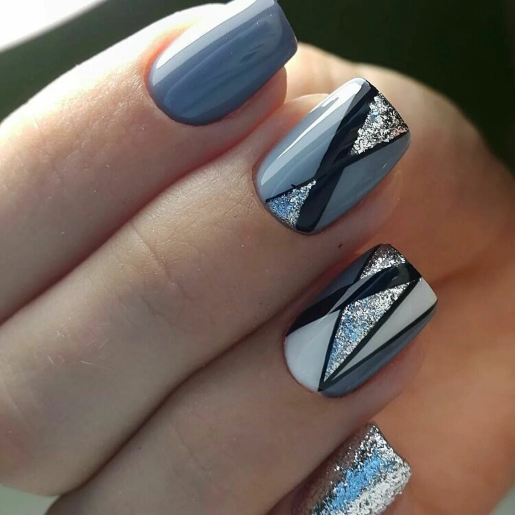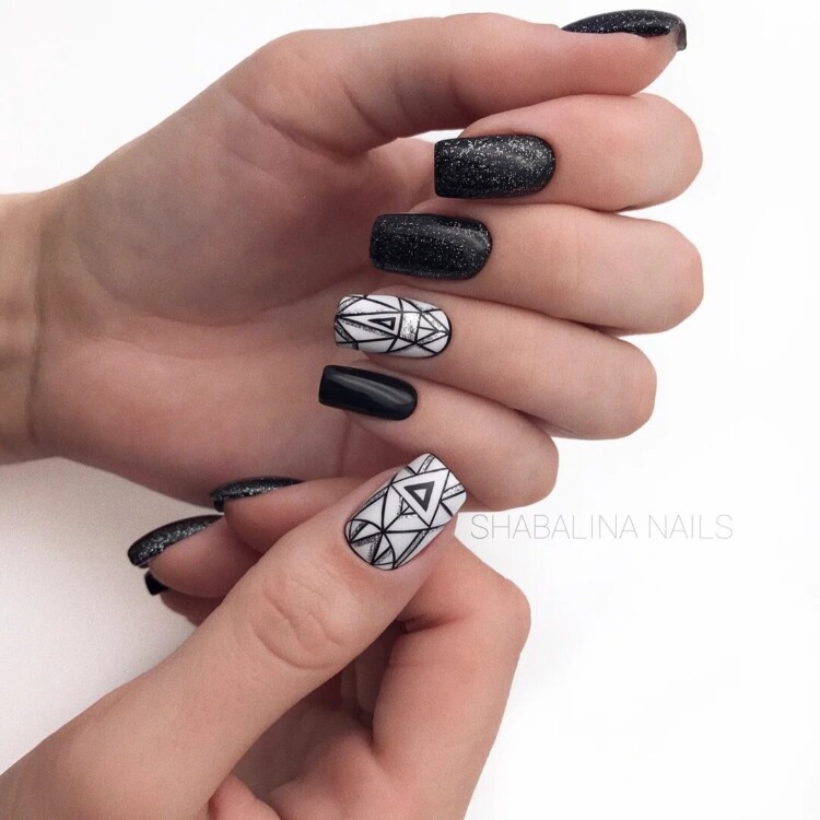 Також добре виглядає контрастний манікюр в чорно-білих тонах. Тут вже на свій розсуд можна підібрати геометричний малюнок, який прекрасно впишеться в образ і зробить його більш оригінальним. Також один нігтик можна виділити в срібному вигляді за допомогою блискіток.