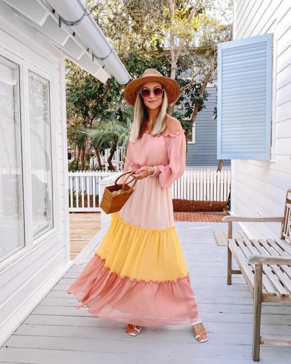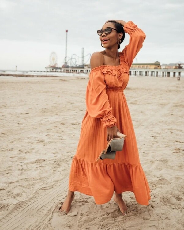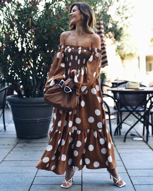 Модель сукні іспанка з довгим фасоном зазвичай представлена в стилі бохо. Її вибирають для літніх аутфітів завдяки повітряній і легкій тканині. Найбільш популярні сукні іспанка – мереживні фасони довжини максі. За рахунок жіночного фасону під нього можна підібрати абсолютно будь-яке взуття: босоніжки на підборах або танкетці, плоска підошва або витончені балетки. Для молодих і екстравагантних дівчат підійде більш оригінальне взуття до кокетливої сукні – ковбойські чобітки.