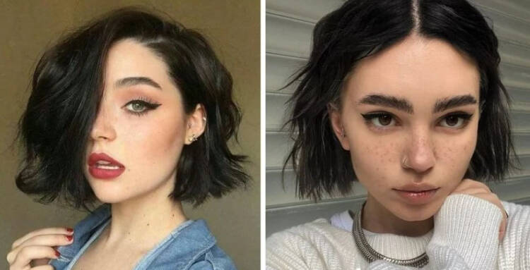 Багатошаровий короткий боб з довгим чубчиком можна укласти або гладко, або легкою хвилею. Не забудьте про текстуруючу пудру на корені, щоб обсяг вийшов пишнішим.
