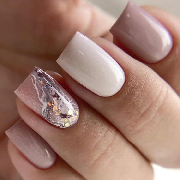 Щоб урізноманітнити манікюр в світлих тонах, його можна доповнити декором і візерунками, використовуючи модні в 2021 році техніки: акварель, абстракція, мінімалізм, флористичні мотиви і negative space. Останній варіант зараз найбільш популярний.