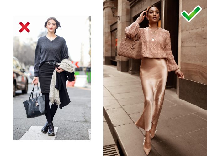 Не варто одягати тоненький джемпер і такий самий низ. Атласна спідниця зі светром фактурної в’язки виглядає набагато цікавіше — вся справа в контрасті.