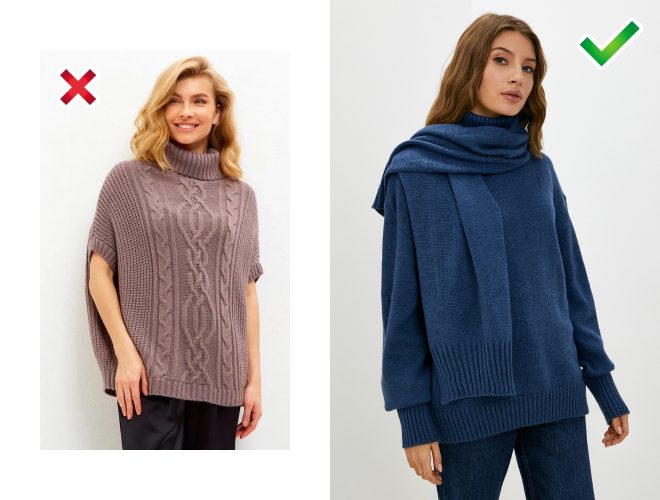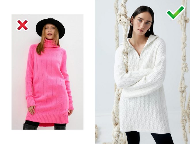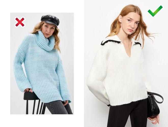 Невдала модель: вона морально застаріла та ще й візуально з’їдає шию. Краще вибрати вільний подовжений светр з коміром поло. Такий класно виглядає з легінсами.