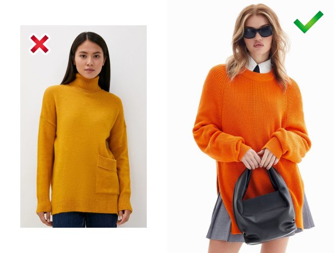 Невдала модель: вона морально застаріла та ще й візуально з’їдає шию. Краще вибрати вільний подовжений светр з коміром поло. Такий класно виглядає з легінсами.
