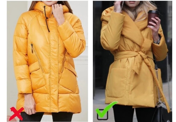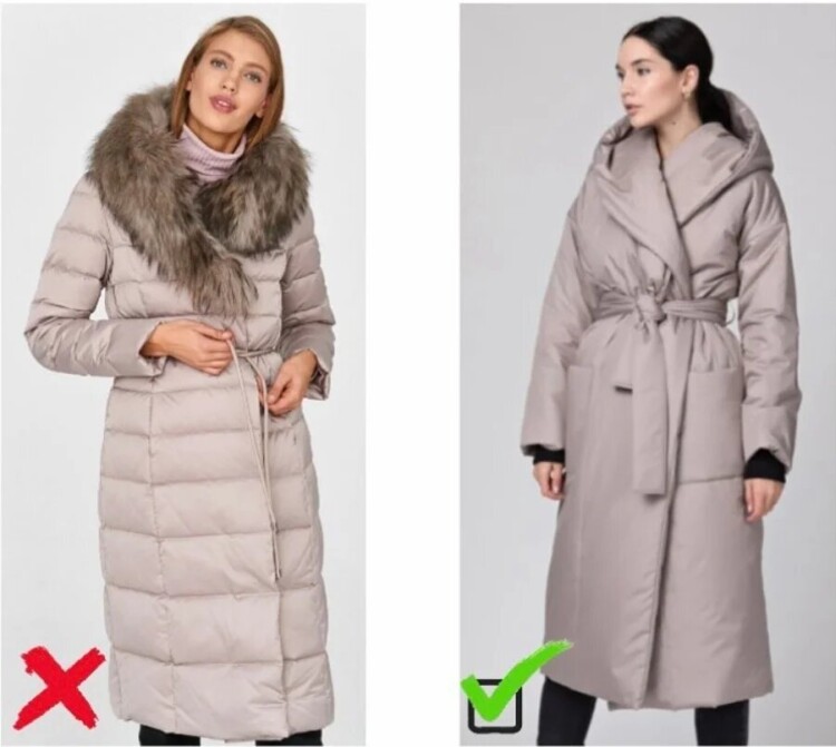 На фото зліва у пуховика занадто обтислий крій – це особливо помітно, якщо подивитися на рукава. Такі пуховики сьогодні вже не актуальні, краще замінити їх на куртку прямого або напівобтислого крою. Якщо потрібно зробити акцент на талії, використовуйте пояс. Також по можливості позбавляємося від хутра на капюшоні, рукавах і кишенях.