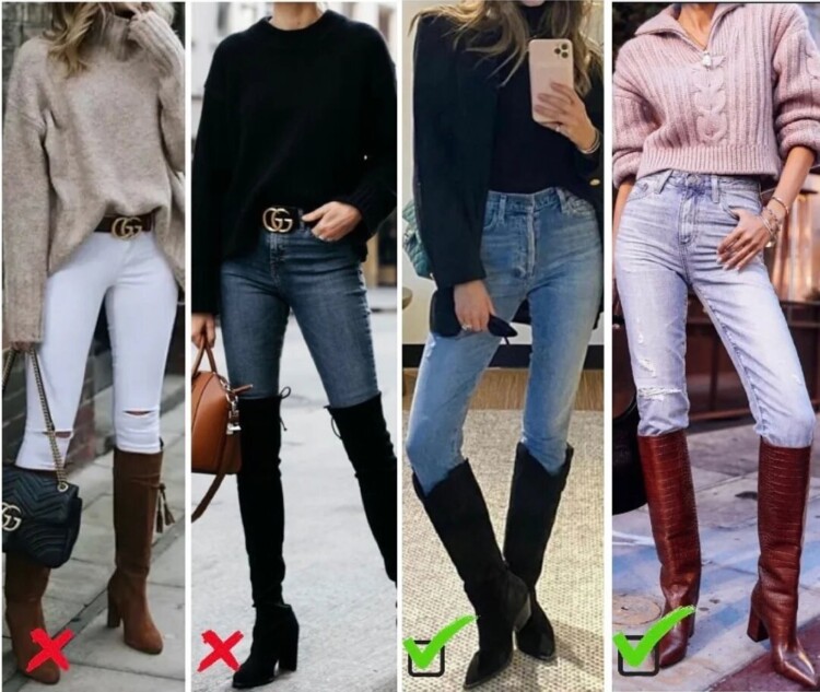Якщо ви хочете заправляти джинси в чоботи, стежте за тим, щоб чоботи були досить вільними, “з повітрям”, не сиділи в обтяжку по нозі. Джинси тут можуть бути будь-які – не тільки вузькі. Якщо чоботи перетискають ногу, то це застаріле поєднання, краще від нього відмовитися.