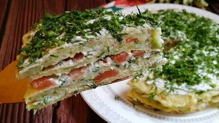 Готовий закусочний торт зверху присипаємо зеленню. Для стабілізації його, звичайно, потрібно прибрати в холодильник на 4 години. Але можна подавати до столу і одразу, виходить дуже смачно.