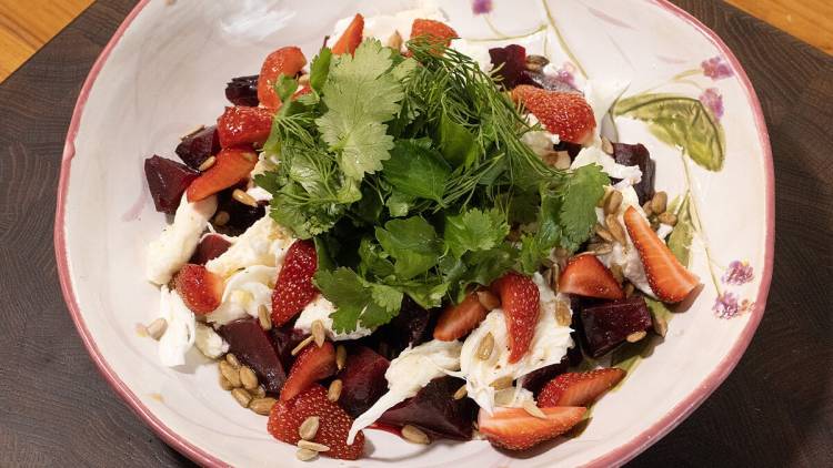 Очищений запечений буряк нарізаємо шматочками, полуницю ріжемо на 4 частини і відправляємо в миску. Додаємо шматочки моцарели та насіння соняшника. У піалу наливаємо олію, солимо-перчимо і видавлюємо з дольки лимона сік. Перемішуємо і рясно поливаємо салат. Перед подачею прикрашаємо салат зеленню, але краще листочками базиліка. Все перемішуємо та насолоджуємося смаком.