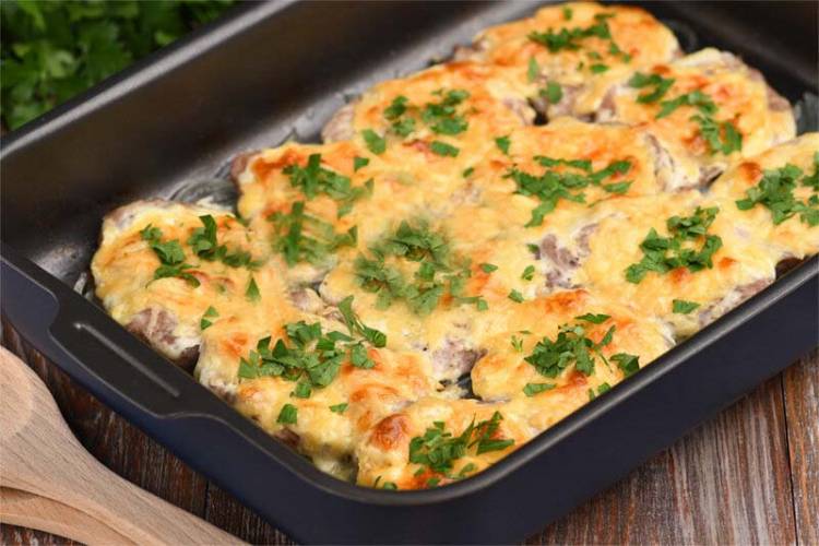 Готові свинячі відбивні виймаємо. За рахунок цибулі та сиру блюдо пахне приголомшливо.