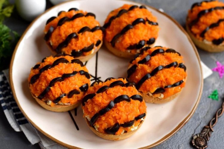 Рецепт оригінальної закуски, яка чудово підійде до новорічного столу у Рік Тигра. Подається закуска на спільній тарілці як порційні тарталетки з начинкою. Для начинки використовуємо дрібну нарізку слабосоленого оселедця, м’якого сиру та яєць. Після наповнення тарталетки довгий час не розмокають, залишаються щільними та хрусткими. Завдяки моркві та оливкам зовнішній вигляд закуски нагадує тигра – символ Нового Року.