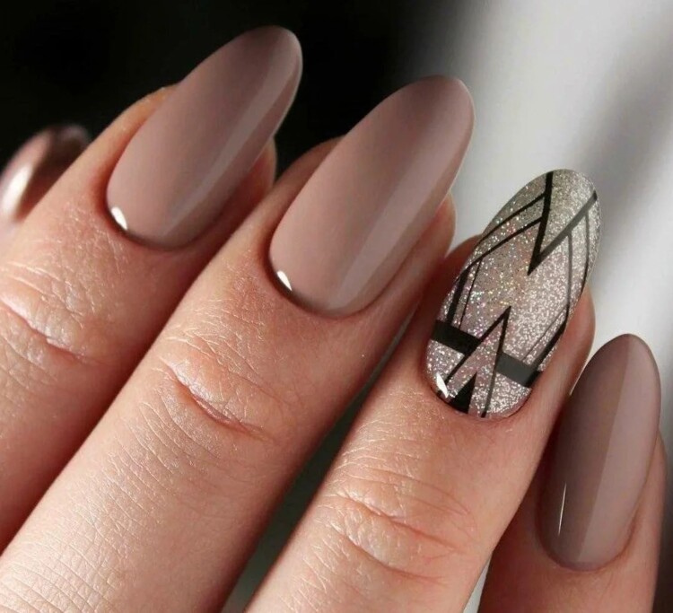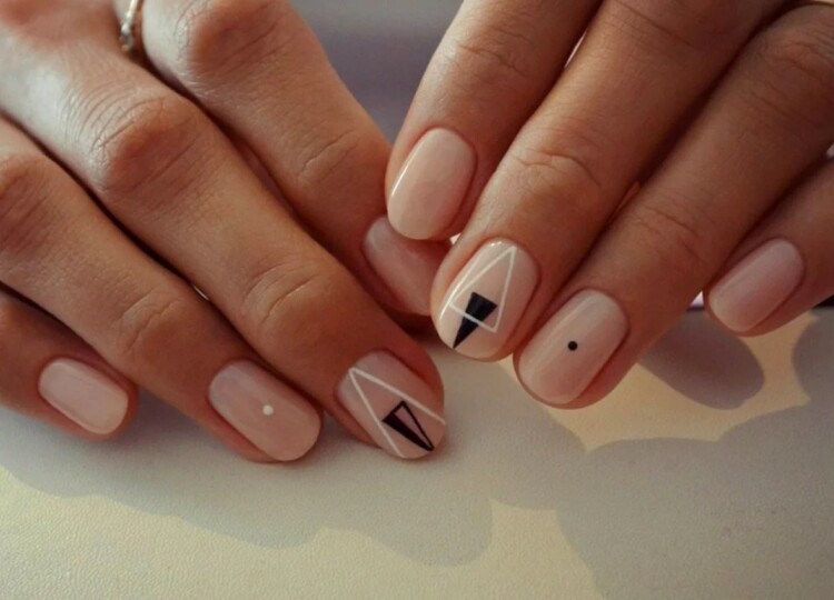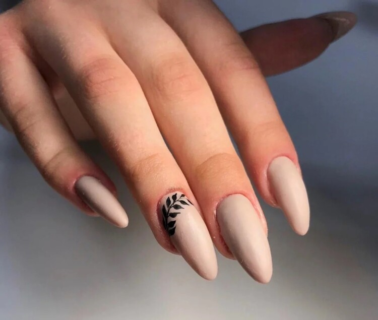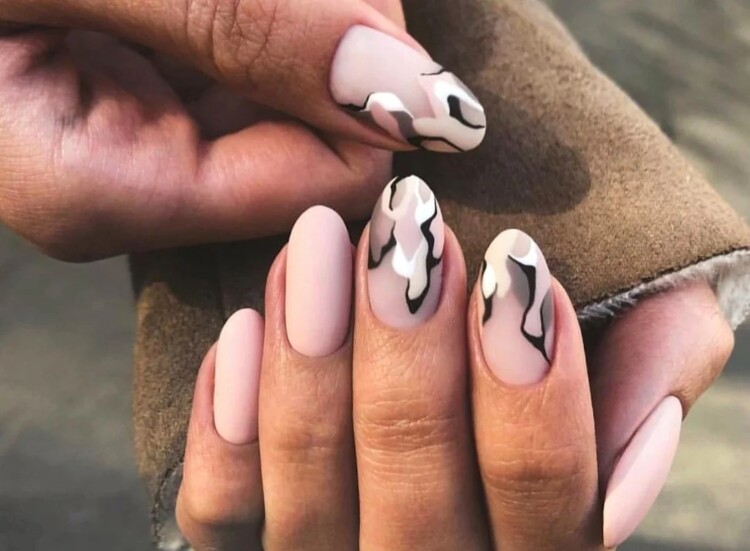 Якщо любите щось креативне, то зверніть увагу на цей манікюр. У ньому бежевий колір узятий за основу, а поверх нього зроблений цікавий візерунок в чорно-білих відтінках.
