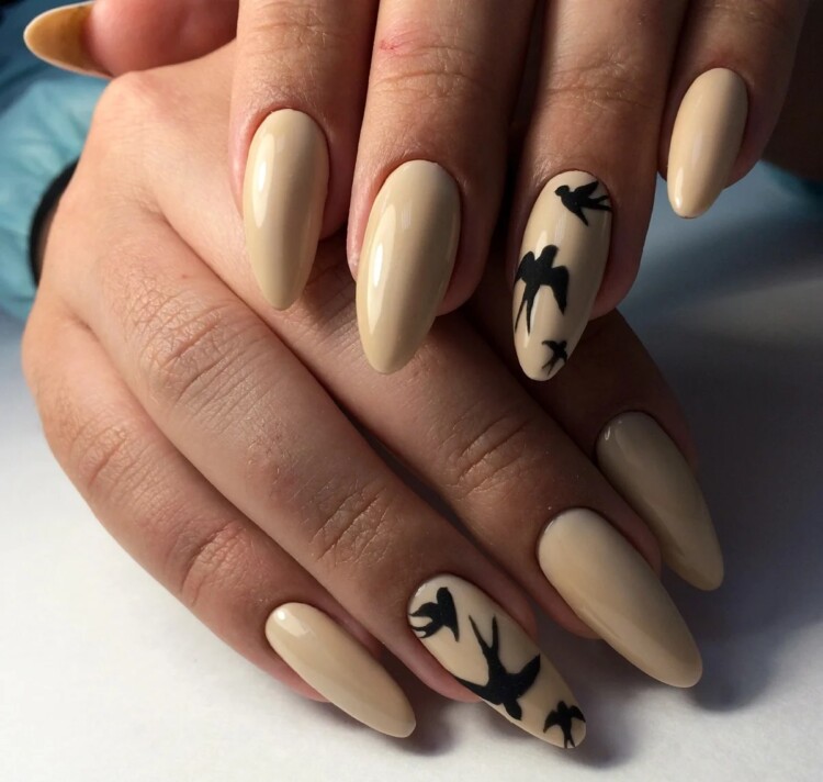 Пташки на нігтях – це тренд цього року. Ви можете також розмістити силуети птахів на свій манікюр. А бежевий колір стане відмінною основою для нього.