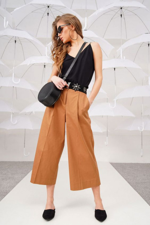 Брючини середньої довжини, тому відкриваються щиколотки і ікри. Кюлоти відмінно підійдуть для вихідних днів або повсякденних образів. Але їх не варто використовувати в якості заміни вільних ділових брюк для офісного стилю.