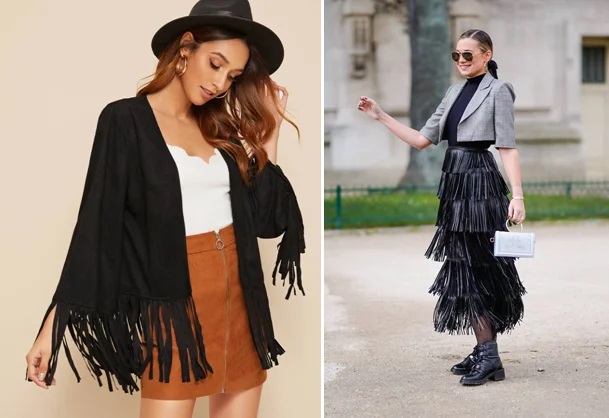 Одним з провідних елементів осіннього одягу в цьому сезоні є бахрома. Вона органічно доповнює верхній одяг, сукні з довгим рукавом, костюми. Вважається, що чим довша бахрома, тим ефектніше образ. Вона може покривати наряд від верху до низу. Цей тренд легко вписати в будь-який гардероб, адже він підходить будь-якому віку, росту, а також будь-якому типу фігури.