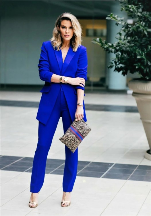 Синій колір в тренді цього сезону, а надівши брючний костюм такого кольору – ви станете найкрасивішою і модною в офісі. Додавши до костюму такого кольору жилет, ви зможете постійно міняти свої образи, підбираючи блузи, топи і сорочки.