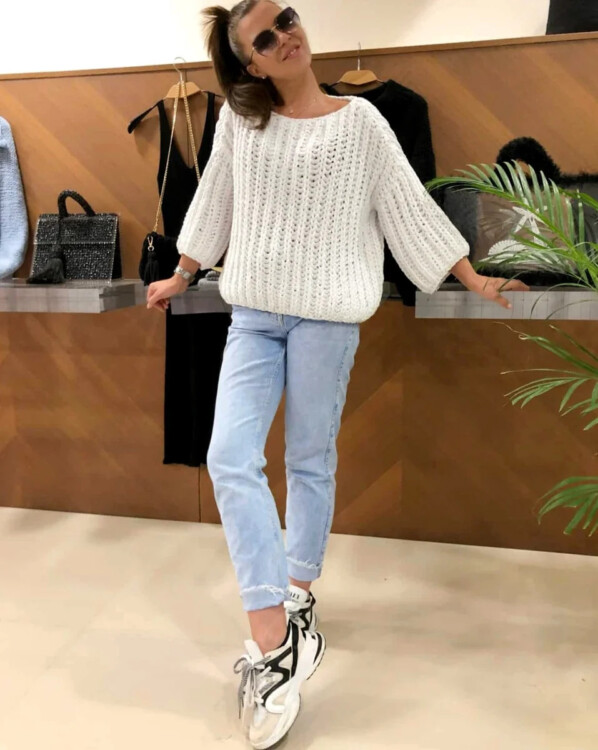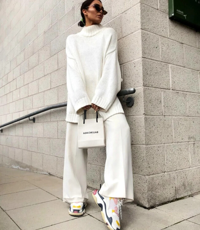 Розслаблений стиль зараз вважається дуже модним. Його відмінна риса – це розслаблені і вільні фасони одягу, без зайвих форм. Найчастіше це вільні брюки і подовжений верх. В даному образі светр в якраз подовженому і вільному фасоні. Взагалі образ можна сміливо назвати білим монохромом.