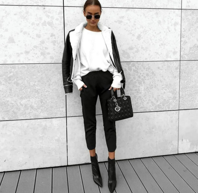 Верх ж в светрі простий, але цікавий. Вільний білий светр заправлений в штани, а інтересу образу додасть другий шар. Це може бути шкіряна або джинсова куртка, пальто або дублянка. Важливо, щоб був цікавий елемент. Тут, наприклад, це комір. Образ вийшов лаконічний і дуже стильний.