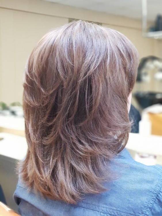 Багатошарова стрижка з довгим або коротким чубчиком підійде для дівчат з витягнутим обличчям. Візуально такий варіант робить обличчя круглішим і згладжує гострі риси обличчя. Також ця стрижка вигідно доповнить образ дівчат, у яких високий великий лоб. Зовні вона надає жіночності, елегантності та зменшує вік. Саме тому такий варіант можуть використати навіть жінки за 50.