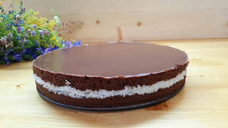 Повертаю форму в різні боки щоб глазур рівномірно розподілилася по всій поверхні. Якщо утворюються бульбашки, прибираю їх зубочисткою. Торт ставлю в холодильник мінімум на 2 години.