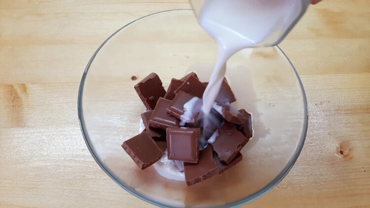 Занурюю всі часточки шоколаду в молоко і залишаю на 2 хвилини. Все перемішати. Шоколад швидко розчиняється і перетворюється в прекрасну глазур. Поливаю цієї глазур’ю торт.