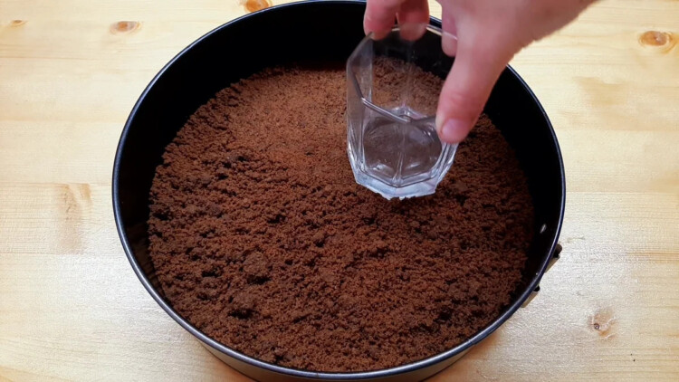 Крихту потрібно розділити на 2 частини. Першу половину крихти висипаю на дно форми. У мене форма зі знімним кільцем діаметром 23 см.