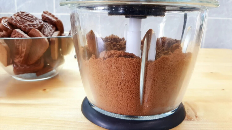 Шоколадне печиво потрібно подрібнити. Я подрібнюю в блендері. Можна покласти печиво в пакет і подрібнити качалкою, в загальному, щоб печиво перетворилося в дрібну крихту.