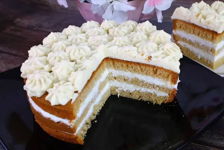 Тепер збираємо торт. У низ кладемо корж, з якого зрізали нерівну верхівку. Викладаємо на нього половину сирно-сметанного крему і розподіляємо рівномірно. Потім накриваємо другим коржем, злегка притискаємо, рівномірно викладаємо залишки крему. І далі накриваємо останнім рівним коржем, який був із найнижчим при випіканні бісквіту. Також притискаємо трохи та відправляємо у холодильник.