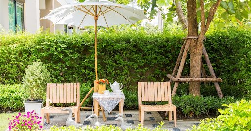 Место отдыха лучше всего дополнить объемным зонтиком. В жаркий и солнечный день он защитит от прямых солнечных лучей, в дождливую погоду – от дождя.