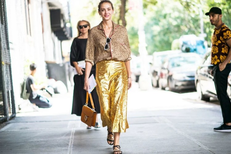 Найпростіше рішення, яке тільки можна придумати – поєднувати золоту спідницю з простим і базовим верхом: однотонним топом, сорочкою або футболкою в нейтральному відтінку. Це безпрограшна комбінація, яка виручить в будь-якій ситуації – базовий однотонний верх в гардеробі є завжди.