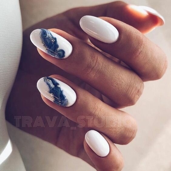 Манікюр для тих, хто сумує по морю. Якщо попросити майстра використовувати блакитні, чорні і сині відтінки лаку в створенні дизайну, то на нігтях вийде таємничий малюнок, що нагадує морську хвилю.