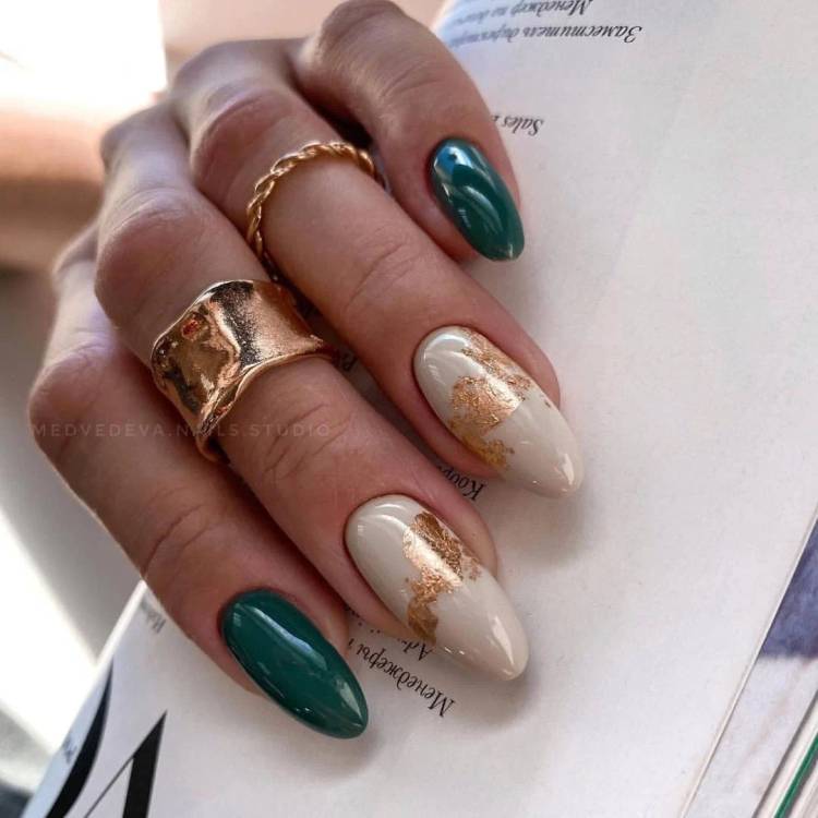 Смарагдовий колір дивовижно виглядає у поєднанні з білим/бежевим/рожевим та дизайном із блиском дорогоцінних металів.