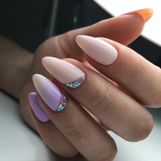 Геометрія як і раніше в тренді. Але в цій добірці дизайн виконується не з допомогою геометричного малюнка. Ефект створюється за допомогою різних відтінків лаку. Такий манікюр виглядає по-весняному радісно!