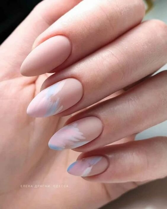 Ще один варіант елегантного, весняного дизайну. Нігті покриваються прозорою базою, а зверху прикрашаються штрихами за допомогою декількох ніжних відтінків лаку. Такий манікюр ідеально доповнить образ для офісу.