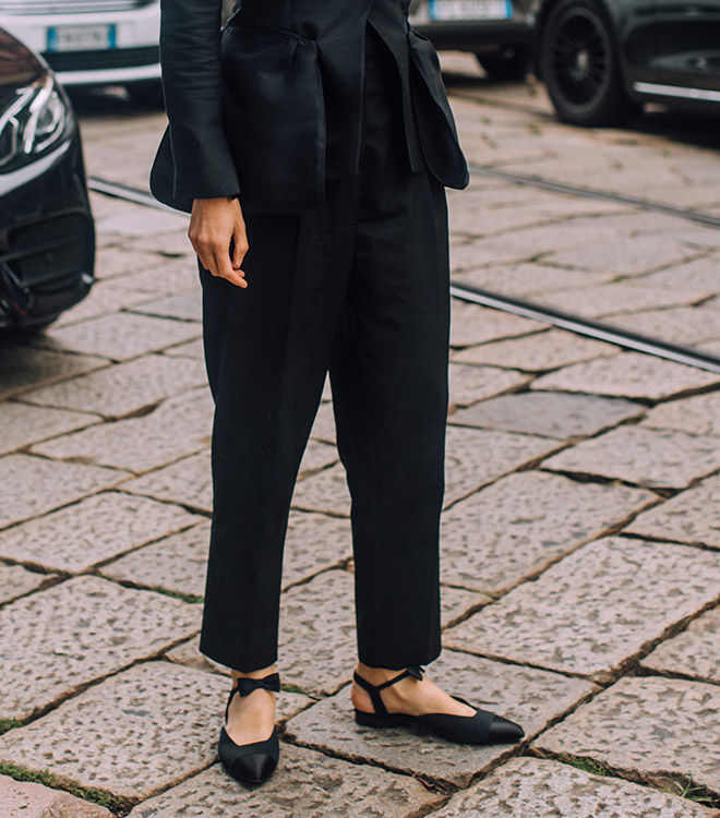 Вибирайте шкіряні балетки – вони прослужать не один сезон і не втратить початкового вигляду, навіть якщо ви будете носити їх щодня. Плюс шкіра проста у догляді, завжди виглядає доречно та не дешевить образ.