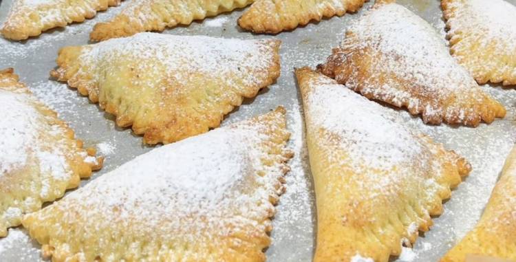 Згортаємо у форму трикутників. Защипуємо краї вилочкою і кладемо на лист, вистелений пергаментом. Запікаємо п’ятнадцять-двадцять хв за температури 200 градусів.