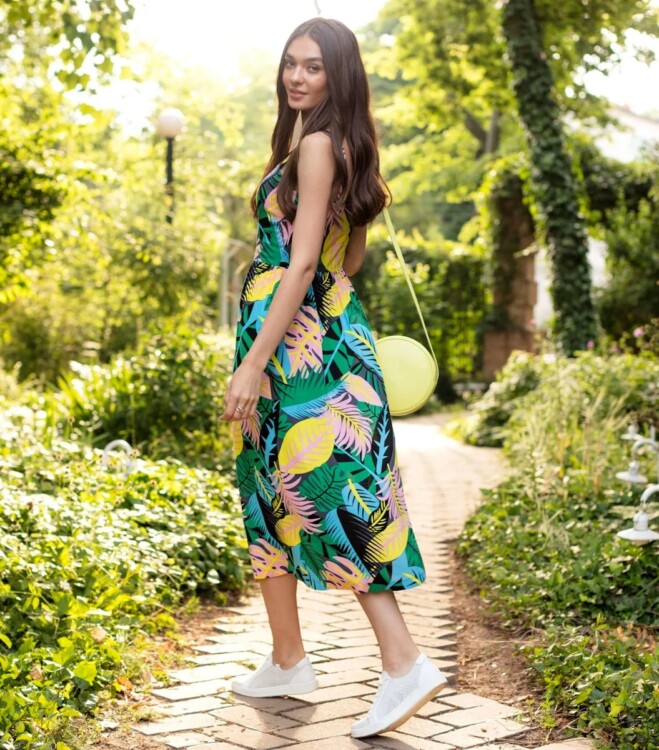 Сукні в тропічному стилі виглядають цікаво і привабливо. Але найчастіше вони яскраві, тому їх можна розбавити нейтральним взуттям і сумкою, як на фото.