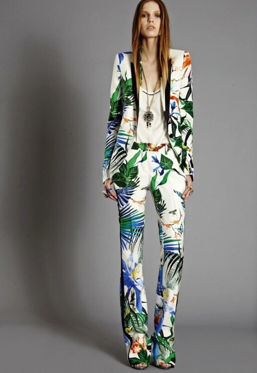 Для любительок брючних костюмів можна розглянути такий варіант. Даний принт універсальний і виглядає добре на будь-якій речі, навіть на брючному костюмі. Якщо у Вас не строгий дрес-код, то такий костюм можна надіти в офіс. А також його можна носити на прогулянку або на вечір, просто міняючи взуття та аксесуари.