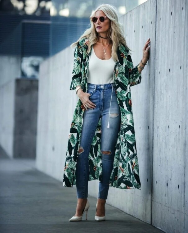 Поєднання білої футболки і синіх джинсів вважається нудним, але це ж ідеальна база, яку можна змінювати за допомогою акцентних речей і аксесуарів. Подивіться як образ заграв новими фарбами, коли в нього додали накидку з тропічним принтом.